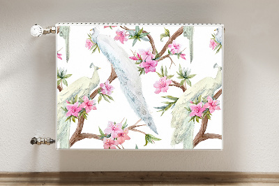 Decoratieve radiatormat Witte pauwen heeft een magneet aan de binnenkant, zodat je hem gemakkelijk aan de radiator kunt bevestigen. Aan de zichtbare buitenzijde is een geselecteerd patroon gemaakt met behulp van een moderne drukmethode.